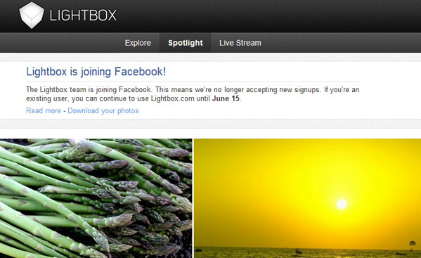 L'app fotografica permetteva di ritoccare e condividere le proprie foto. Dopo l'acquisto di Instagram, Facebook ha deciso di puntare ancora sullo stesso tema: in questo caso però Lightbox ha già annunciato la chiusura e non accetta più nuovi iscritti. A differenza di Instagram, che continuerà a vivere come marchio a sé stante, nel caso di Lightbox Facebook era interessata al team di persone che stava dietro l'applicazione.