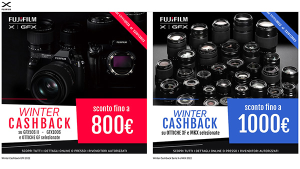 Dal 17 novembre 2022 al 22 gennaio 2023, acquistando una fotocamera o una ottica FUJIFILM in promozione si potrà richiedere un rimborso a seconda del prodotto scelto, da un minimo di 150 fino a 1.000 euro iva inclusa, e per acquisti "multipli" il bonus si somma.
