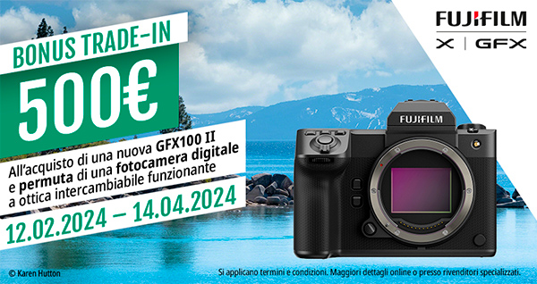 Parlando di grande formato, è per molti il prezzo il principale freno, ma Fujifilm ha avviato oggi un interessante programma Trade-In dedicato a Fujifilm GFX100 II che assicura uno sconto in cassa immediato di 500 euro IVA inclusa all’acquisto di GFX100 II dando in permuta contestualmente una fotocamera digitale a ottica intercambiabile funzionante.