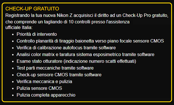 Acquistando presso uno dei punti vendita aderenti all'iniziativa si potrà ottenere subito uno sconto in cassa pari a 200€ per l'acquisto di un corpo Nikon Z6 o Z7 e pari a 300€ in caso di acquisto di kit con ottica. Registrando l'acquisto del prodotto Nikon sul sito nitalvip.it, entro e non oltre 10 giorni dalla data di acquisto come risultante dallo scontrino/fattura, si avrà diritto a riceve una Memory Card XQD da 64GB del valore di 180€ oltre a un coupon per un check-up completo (Check-up, Clean & Fine tuning) utilizzabile entro due anni, di pari valore.