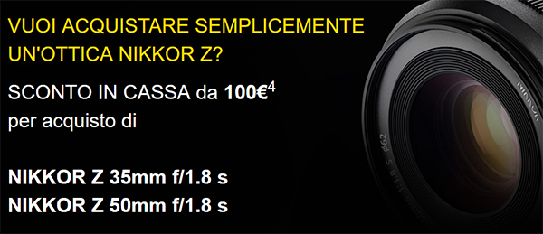 Chi avesse già scelto le mirrorless pieno formato di casa Nikon può comunque approfittare della campagna promozionale e ottenere 100€ di sconto diretto in cassa per l'acquisto delle ottiche Nikkor Z 35mm f/1.8 s e Nikkor Z 50mm f/1.8 s.