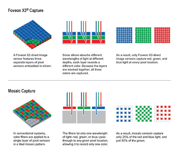 Innanzitutto, è bene ricordare brevemente i fondamenti della tecnologia Foveon. In un sensore convenzionale, i singoli pixel (fotodiodi) sono coperti da un filtro RGB detto "di Bayer", in cui i filtri colorati sono disposti a scacchiera secondo una schema che prevede il 50% di filtri di colore verde e il 25% ciascuno di filtri colore blu e rosso. La prevalenza dei versi è giustificata dal fatto che il canale verde è quello che, per l'occhio umano, è maggiormente correlato alla luminanza e al dettaglio.