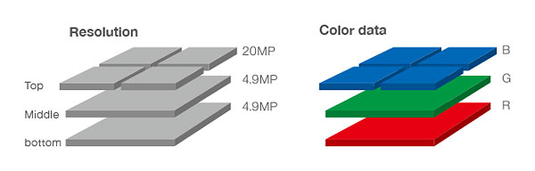 La chiave della tecnologia risiede nella risposta dei tre layer alla radiazione incidente. Si consideri, a tal proposito, che quando si parla colloquialmente di layer blu, si parla in realtà di un layer che ha sì una sensibilità massima centrata sulla lunghezza d'onda del blu, ma è che sensibile anche ad altre lunghezze d'onda. Conoscendo gli spettri di assorbimento, è possibile elaborare le informazioni sui tre layer per propagare le informazioni del layer blu sui livelli inferiori.