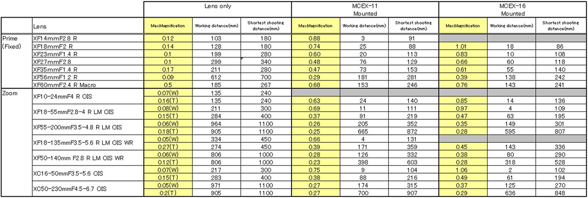 Come si può notare, i tubi di prolunga sono compatibili con la grande maggioranza di obiettivi disponibili: la limitazione principale riguarda l'XF 10-24mm F4 R OIS, che non può essere utilizzato alla minima lunghezza focale con nessuno dei due tubi di prolunga, mentre limitazioni parziali riguardano l'XF 14mm F2.8 R e il nuovo zoom XF 18-135mm F3.5-5.6 R LM OIS WR.