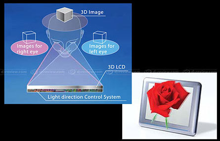 In fase di riproduzione degli speciali pannelli (tra cui quello posto sul retro della fotocamera) permettono la visualizzazione in tre dimensioni delle immagini. Attraverso un “light direction control module” vengono inviate a ciascun occhio le informazioni a lui dedicate, senza l'ausilio di occhiali o altri dispositivi di visione.