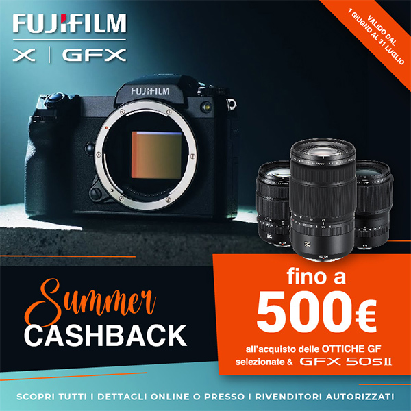 Dall’1 giugno al 31 luglio 2022, è infatti attiva una nuova operazione Fujifilm Cashback, con rimborsi garantiti sull’acquisto di Serie X e Gamma GFX, da un minimo di 200 fino a 1.000 euro IVA inclusa. In particolare lo sconto più goloso è riservato all'interessantissima ottica tele luminosa Fujinon XF200mm F2 R LM OIS WR, che è possibile acquistare con un rimborso di ben mille euro.