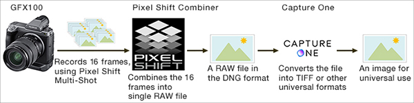 Per accedere alla funzione è necessario aggiornare la fotocamera al firmware 3.00 e scaricare il software Pixel Shift Combiner. La modalità di scatto Multi-Shot è disponibile sia quando si scatta in tethering utilizzando il software sia scattando dalla macchina e importando poi le immagini nel software in un secondo momento. In questo secondo caso il software riconosce automaticamente le 16 immagini da selezionare per la creazione del file finale. Il software restituisce un file RAW da 400 megapixel con estensione .DNG, da sviluppare poi con Capture One (o Photoshop e Lightroom) per creare, ad esempio, la versione TIFF o in altri formati universali. Il software impiega circa un paio di minuti per elaborare i 16 scatti e il risultato finale è un file .DNG da circa 1,5 GB.