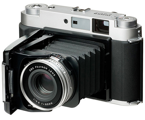 Un rumor - al momento ancora allo stadio embrionale - sembrerebbe indicare la volontà di Fujifilm di fare un grande passo e saltare direttamente al medio formato, pur mantenendo delle dimensioni compatte. Le indiscrezioni parlano di un corpo in stile X-Pro, che potrebbe richiamare l'attuale Fujifilm GF670 - qui sotto in foto -, medioformato a telemetro in grado di scattare in formato 6x6 e 6x7 e dotata di obiettivo ripiegabile a soffietto per contenere gli ingombri quando non in uso.