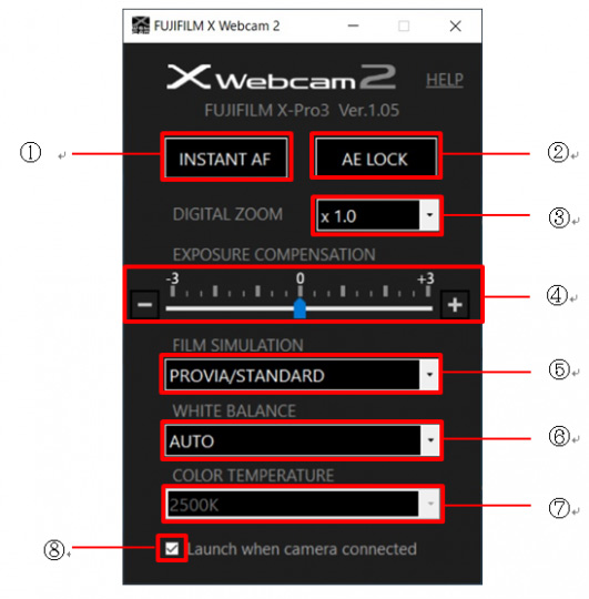 Fujifilm presenta ora la nuova versione del programma, FUJIFILM X Webcam Version 2.0. La nuova versione permette maggiore controllo della fotocamera durante le videoconferenze, con la possibilità di modificare la resa delle immagini con le simulazioni pellicola, ma anche effettuare il blocco AE per un'esposizione costante, di regolare lo zoom digitale, la compensazione dell'esposizione e il bilanciamento del bianco, oltre che di sfruttare la funzione Instant AF quando le fotocamere sono impostate in modalità di messa a fuoco manuale.