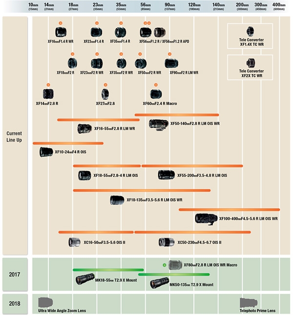 Con il lancio delle due nuove ottiche Cine, Fujifilm ha anche colto l'occasione per aggiornare la sua roadmap delle ottiche e ora sappiamo che nel 2018 arriveranno anche uno zoom ultragrandangolare e un'ottica tele a focale fissa. Sul primo ci sono già rumor che parlano di un 8-16mm F2.8, nel secondo caso potrebbe trattarsi di un 200mm a elevata apertura. Al momento l'ultimo obiettivo presentato in ambito fotografico è stato il Fujinon XF 50mm F2 R WR, lanciato un mese fa.