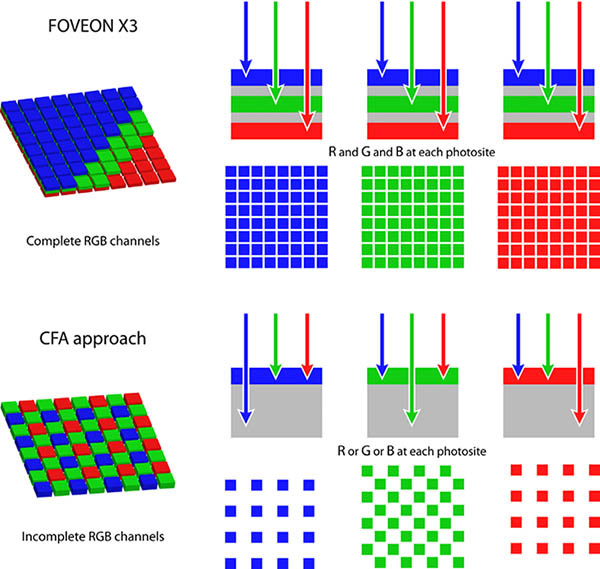 Lo ricordiamo, la tecnologia Foveon è totalmente diversa da quella utilizzata dai normali sensori, che sono formati (semplificando) da uno strato di silicio fotosensibile a tutte le componenti della luce visibile a cui viene sovrapposta una matrice di pixel colorati RGBG per permettere al sensore di leggere i colori dell'immagine; senza essa il sensore sarebbe monocromatico e in grado di 'vedere' solo in scala di grigi. Nei sensori con matrice Bayer ogni pixel vede quindi un solo colore e il processo di demosaicizzazione permette poi', a partire dal colore visto dal pixel e da quelli rilevati dai pixel adiacenti, di ricostruire le tre componenti colore in ogni punto.