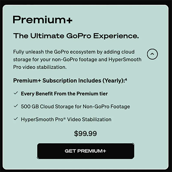 Oltre all'app per i computer Apple, GoPro oggi presenta anche un nuovo livello di iscrizione ai servizi GoPro, rinominato Premium+, dal costo annuale di 99,99€, che offre funzionalità e vantaggi aggiuntivi rispetto al livello di iscrizione standard, che ora viene denominato Premium (dal costo annuale di 49,99€).