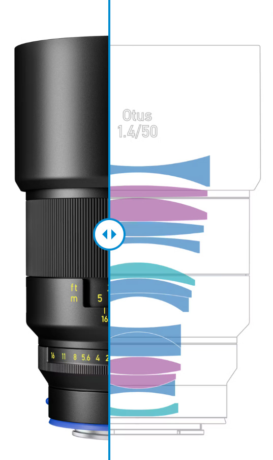 ZEISS Otus ML 1.4/50 ha una distanza minima di messa a fuoco pari a 50 cm e un design Distagon da 14 elementi in 11 gruppi.