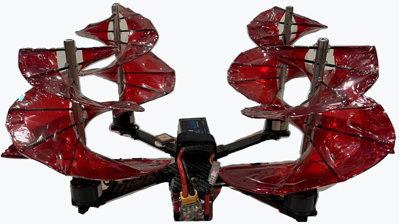Tornando al progetto moderno, il drone ha quattro ali a forma di cavatappi in plastica, ma invece di farle girare (o pompare) a mano come proposto da Vinci, queste ali sono alimentate da batterie e motori elettrici. Austin Prete, che fa parte del team di ingegneri del progetto e ha costruito Crimson Spin per il suo master, ha pilotato il dispositivo per diversi brevi viaggi e ha presentato il primo video dell'aereo in volo alla conferenza Transformative Vertical Flight .