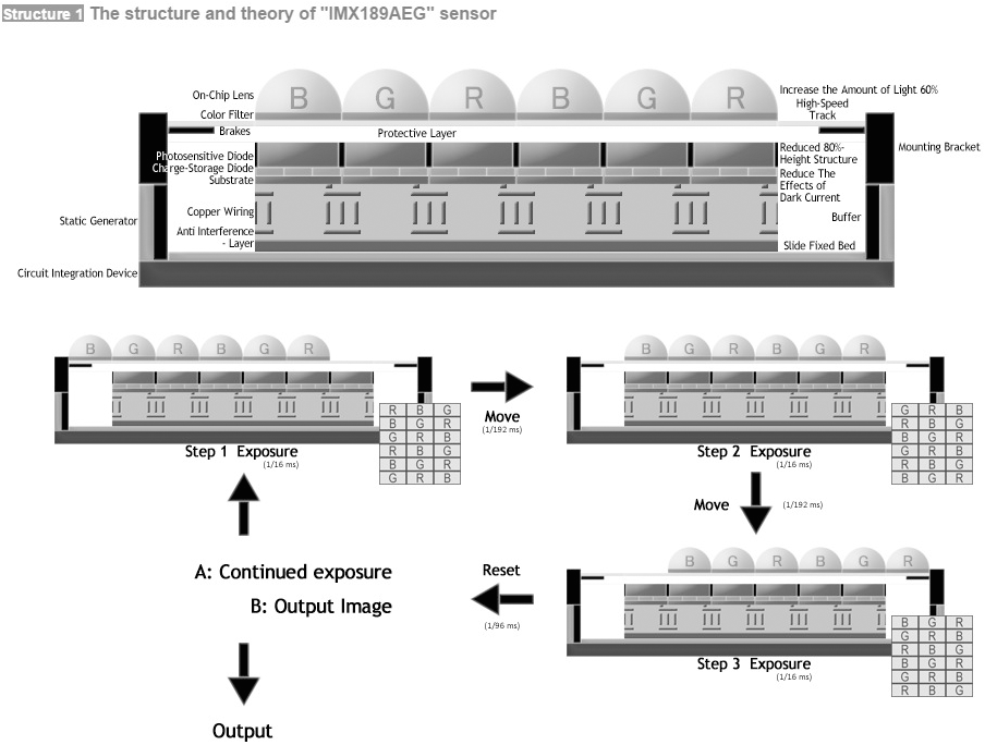 Il tentativo di superare tale limite non è certo nuovo. Molti conoscono, ad esempio, la tecnologia Foveon. L'approccio Sony, però, è diverso: il filtro di Bayer è comunque presente, e sotto di esso si trova ancora un sensore tradizionale, ma tale filtro è mobile. Muovendo il filtro di un pixel a ogni posa e registrando tre pose consecutive, che vengono poi elaborate per costruire l'immagine finale, si ottiene un risultato facilmente intuibile: ogni pixel contiene il 100% delle informazioni cromatiche.
