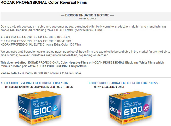 Sotto l'amministrazione controllata del Chapter 11 Kodak sta cercando di ristrutturare i diversi rami aziendali e le pellicole per diapositive sono finite nella cesoia dei tagli. Kodak ha annunciato di aver cessato la produzione delle pellicole invertibili per diapositive KODAK PROFESSIONAL EKTACHROME E100G Film, KODAK PROFESSIONAL EKTACHROME E100VS Film, KODAK PROFESSIONAL ELITE Chrome Extra Color 100 Film a causa di una domanda in forte calo.