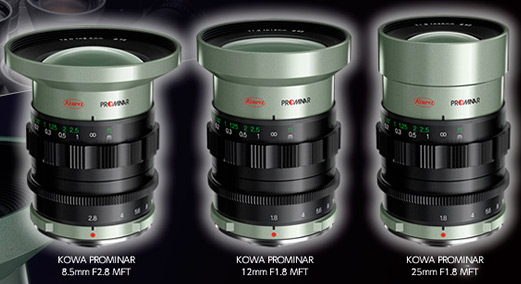 Si tratta del grandangolo spinto Kowa Prominar 8,5mm F2.8, con focale equivalente 17mm, del grandangolo luminoso Kowa Prominar 12mm F1.8, con focale equivalente 24mm e del normale luminoso Kowa Prominar 25mm F.18, con focale equivalente a quella di un 50mm su full frame.