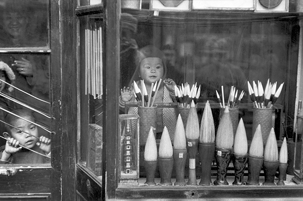 In Lui Chi Chang, la via dei negozi di antiquariato, la vetrina di un venditore di pennelli. Pechino, dicembre 1948 Vintage gelatin silver print © Fondation Henri Cartier-Bresson / Magnum Photos