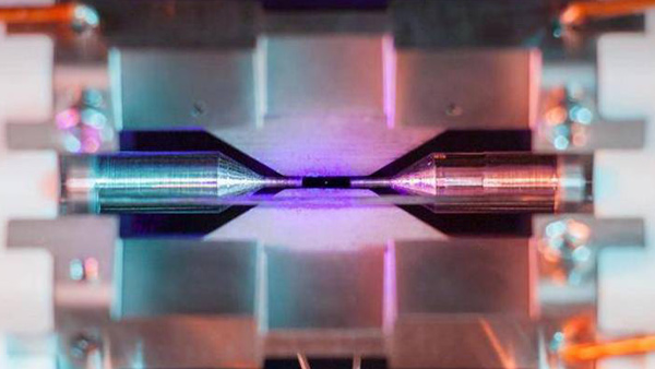 La distanza tra i due elettrodi è di appena un paio di millimetri: è necessario ingrandire l'immagine per poter apprezzare l'atomo che appare come un piccolo puntino.