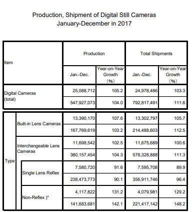 Si parte da una buona notizia: sebbene di poco, sia il volume sia il valore delle fotocamere digitali è stato nel 2017 in crescita rispetto all'anno precedente. Dopo anni di calo (alcuni dei quali di caduta libera) è un segnale positivo per tutto il comparto, che pare aver ritrovato una dimensione di equilibrio. La bolla delle compatte e il suo scoppio a causa dell'agguerrita concorrenza degli smartphone sono ormai alle spalle. Diversi analisti fanno notare come il 2016 sia stato un anno particolarmente difficile per il comparto a causa del terremoto che ha colpito la zona di Kumamoto, cuore della produzione di sensori e di parti fondamentali della filiera di diversi marchi di primo piano.