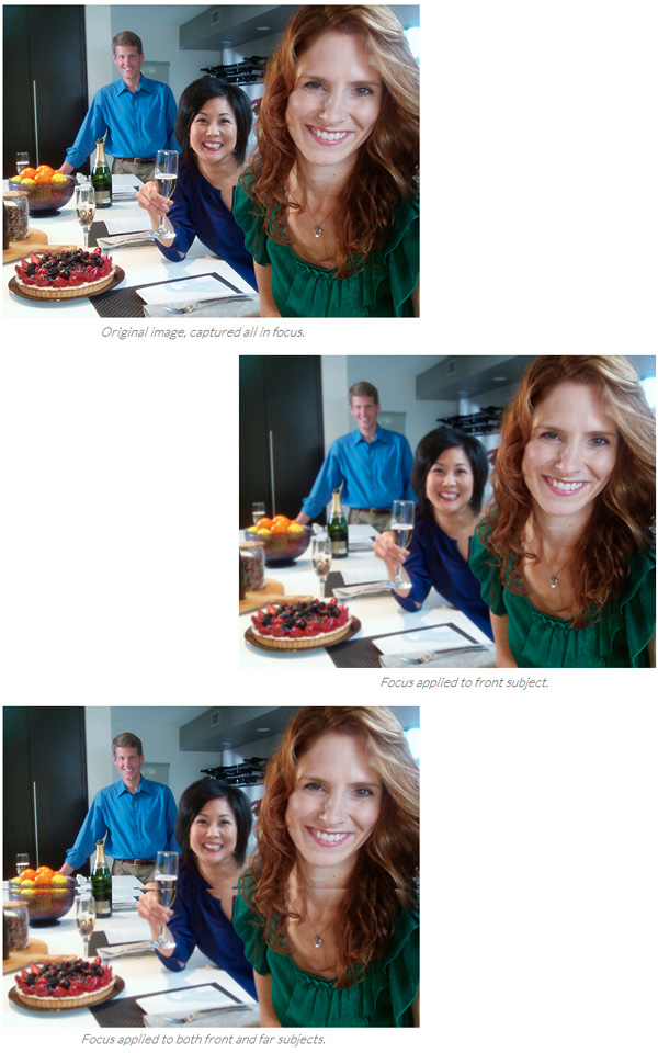 Inoltre il modulo può essere utilizzato anche come una fotocamera normale, con scatti a circa 8 megapixel e video Full HD a 30fps. Per quanto riguarda invece le funzionalità di messa a fuoco dopo lo scatto, la fotocamera riprende immagini con profondità di campo infinita, con tutti i soggetti a fuoco e poi si occupa di applicare il fuoco selettivo durante la visualizzazione delle immagini. In modo molto diverso da quanto accade della fotografia tradizionale è addirittura possibile mettere a fuoco due soggetti che si trovano a distanza differente dal punto di ripresa.