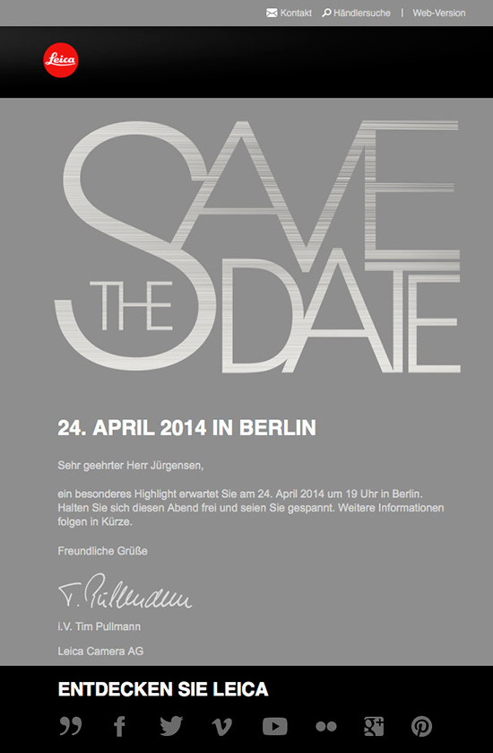 Periodo di grande visibilità per Leica: dopo le versioni del centenario della compatta D-Lux 6 e della reflex medio formato Leica S e dopo lo strano connubio tra Hello Kitty e Playboy che campeggia su una versione speciale di Leica C presentata dalla francese Colette, ora arriva il Save The Date per il 24 aprile 2014.