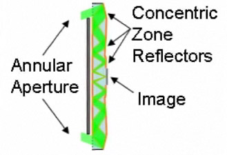 In pratica la luce entra dall'anello più esterno e attraverso diverse riflessioni esce dalla lente centrale verso il lato posteriore, dove può essere alloggiato un sensore digitale.