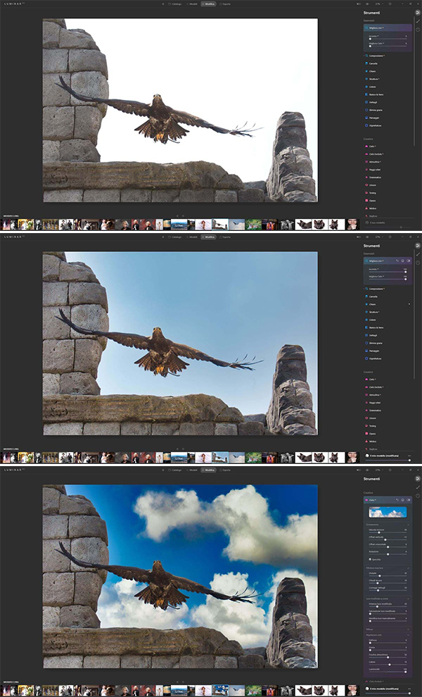 Spesso infatti un cielo nuvoloso o piatto può inficiare negativamente la resa finale di uno scatto e il software permette di avere grande libertà in post produzione nell'intervenire su questo elemento, che in molti casi rappresenta almeno un terzo dell'inquadratura. Non dobbiamo pensare solo a Instagrammer con il dito facile sugli slider degli effetti: capita spesso di dover sostituire o modificare elementi negli scatti professionali. Pensiamo solamente a lavori legati alla moda o alle campagne pubblicitarie. Anche per un matrimonialista potrebbe essere molto utile intervenire sul cielo (e sui relativi riflessi sull'acqua o sulle superfici lucide) per dare un tocco in più alle foto più importanti del servizio.