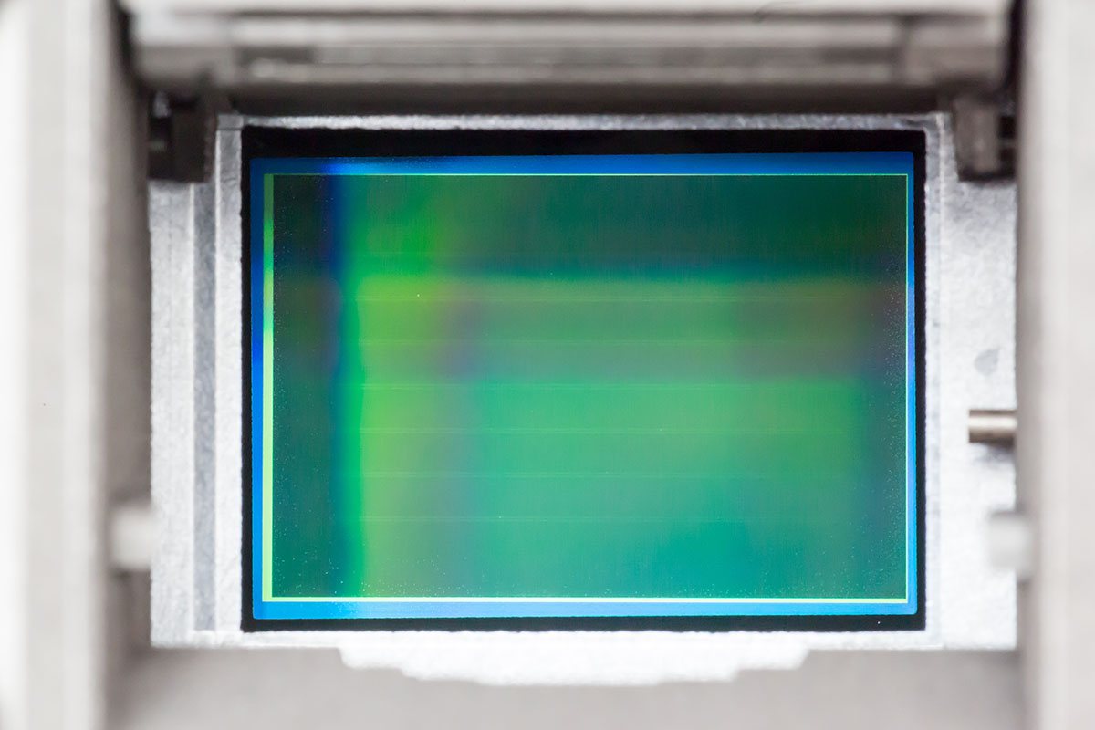 Il sensore della Canon EOS 750D in nostro possesso. Si notano piccole macchie bianche negli angoli e ai bordi.