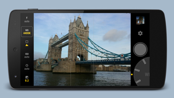 Oltre a supportare il salvataggio dei file RAW, l'applicazione permette di scattare foto in modalità manuale, gestendo i vari aspetti attraverso un'interfaccia intuitiva e poco invasiva. Con la barra nella parte sinistra sarà possibile gestire flash, bilanciamento del bianco, valore di ISO, esposizione, messa a fuco e tempo di esposizione. Sulla destra, inoltre, troveremo una ghiera digitale con cui gestire velocemente tutte le funzioni appena elencate.