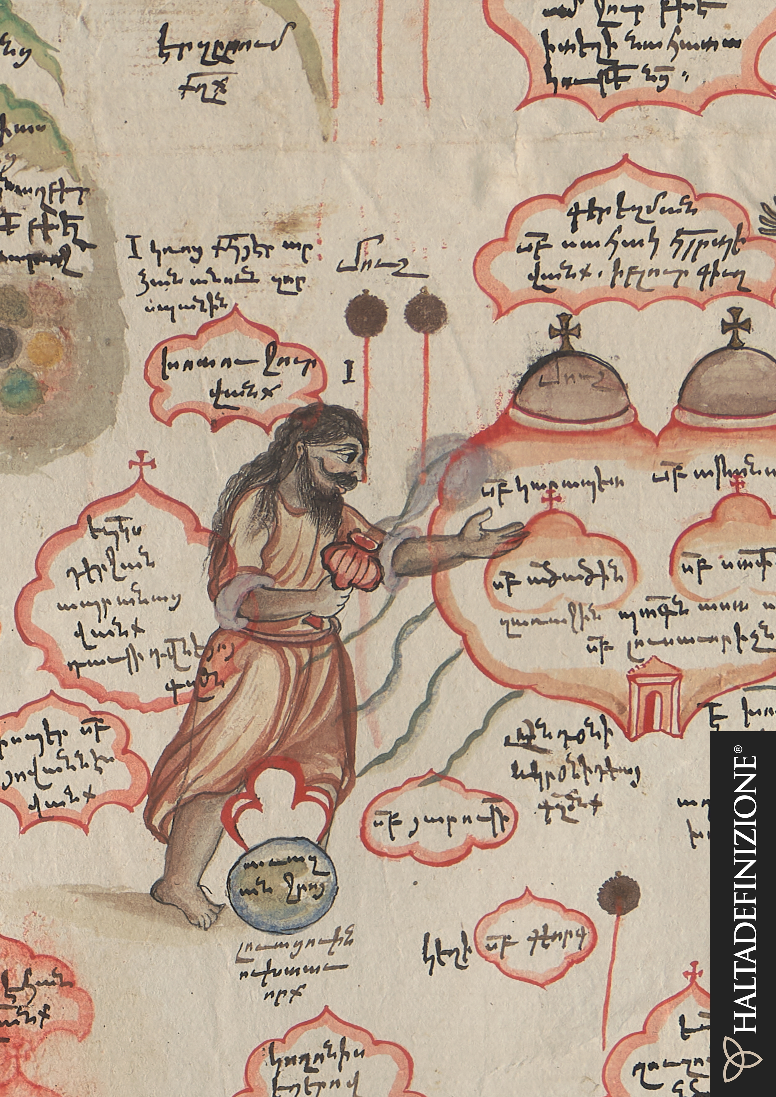 Il Rotulo 24 del Fondo Marsili, annotato sul verso come Tabula Chorographica Armenica, è una straordinaria mappa della Chiesa armena rinvenuta nel 1991 nei depositi della Biblioteca durante i lavori preparatori della mostra cartografica “Esplorazioni in Biblioteca”. Realizzata su 16 fogli di carta incollati su tela, la Mappa, caratterizzata da imponenti dimensioni (358 x 120 cm), è costellata da disegni colorati ad acquerello e da didascalie in armeno relative a centinaia di monasteri, chiese, eremi, santuari e luoghi di culto ripartiti secondo le quattro circoscrizioni o catolicosati esistenti all’epoca della sua realizzazione.
