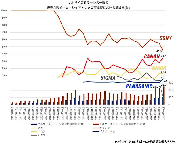 A molti potrebbe stupire il fatto che Sigma fosse davanti a Panasonic, ma qui entra in gioco proprio la particolarità del mercato nipponico, dove, a differenza del resto del mondo, la presentazione della piccola mirrorless full frame Sigma FP aveva fatto fare un netto balzo al marchio, che era arrivato anche a superare Nikon.