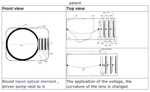 Uno degli ultimi brevetti venuti alla luce copre una tecnologia per un nuovo design di lenti liquide, un tema che ciclicamente torna a fare parlare di sé. Generalmente si utilizzano due liquidi e con l'applicazione di una corrente elettrica se ne modifica la curvatura all'interfaccia, ma il brevetto Canon ha un approccio completamente diverso basandosi su un sistema di micropompe, che dovrebbero permettere un controllo più preciso e stabile della curvatura della lente liquida. Controllando tramite le pompe le quantità dei liquidi all'interno della camera è possibile modificare la curvatura della lente.
