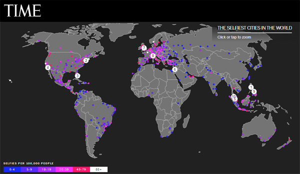 Leader della speciale classifica è Makati City, importante centro finanziario delle Filippine. La classifica è stata stilata analizzando un database di oltre 400.000 foto su Instagram con due caratteristiche: da un lato il fatto di contenere il tag #selfie, dall'altro di avere allegati i dati geografici.