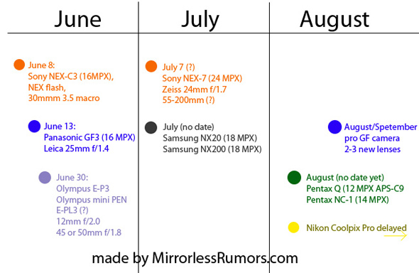 Muovendoci ancora più in là nel tempo troviamo ancora Panasonic pronta con qualche sorpresa. Grosse novità con nuovi ingressi nel settore sono previste a partire da agosto: Pentax sembra stia finalizzando i suoi due sistemi mirrorless a ottiche intercambiabili NC-1 (14 megapixel su sensore da compatta) e Q (APS-C CMOS BSI da 12 megapixel). Nikon pare invece aver subito qualche ritardo, a causa dei problemi seguiti a terremoto e tsunami, ma entro la fine dell'anno potrebbe scendere in campo con la sua Coolpix Pro.