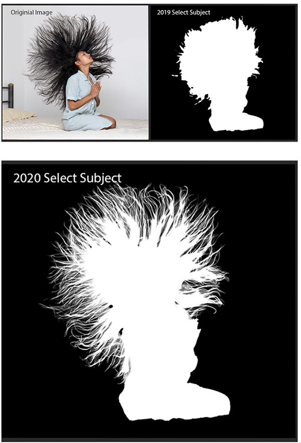 Photoshop ha ricevuto diverse importanti novità, sia nella versione desktop, sia in quella per iPad. Molte di esse sono basate sul motore di intelligenza artificiale Sensei AI. Sale di livello lo strumento di selezione dei soggetti e la maschera, ora in grado di scontornare con efficacia anche i soggetti complessi, come le chiome femminili. Nella versione 2020 Adobe promette risultati ottimi già al primo colpo, evitando quel lavoro di fino che fino a oggi era richiesto per scontornare soggetti con chiome complesse.