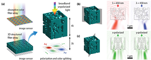 Un gruppo di ricerca del Kavli Nanoscience Institute, del Thomas J. Watson Sr. Laboratory of Applied Physics e del California Institute of Technology di Pasadena, è però al lavoro per trovare una nuova via alla soluzione del problema. I ricercatori hanno dimostrato la fattibilità dell'utilizzo di nanostrutture 3D al di sopra dei pixel per dividere il cammino ottico delle diverse lunghezze d'onda della luce, separando il fascio nei diversi colori, senza dover assorbire luce nel processo. Possiamo pensare a questo strato di materiale dielettrico con struttura 3D come a dei microprismi, fabbricabili direttament e sul sensore con i normali processi di produzione dei semiconduttori.