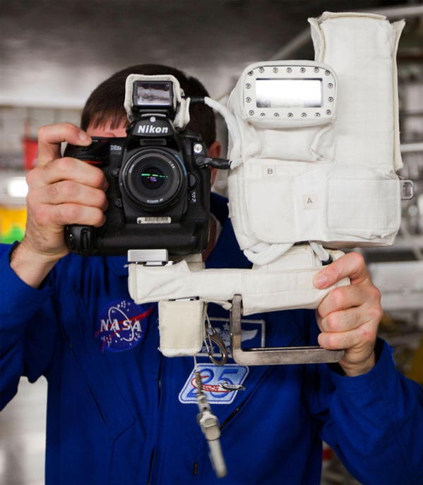 Negli ultimi giorni hanno suscitato grande curiosità in rete alcune immagini di Nikon 'spaziali', in particolare l'attenzione degli appassionati si è focalizzata sull'attrezzatura accessoria e le coperture delle Nikon D2Xs utilizzate negli scatti. Da un lato troviamo l'autoritratto scattato da Mike Fossum durante una passeggiata spaziale: la forte curvatura della sua visiera a specchio regala un effetto fish-eye che cattura le mani dell'astronauta, la macchina fotografica, lo shuttle Atlantis agganciato alla Stazione Spaziale Internazionale e sullo sfondo il nostro pianeta. La macchina è coperta da un particolare incolucro bianco.