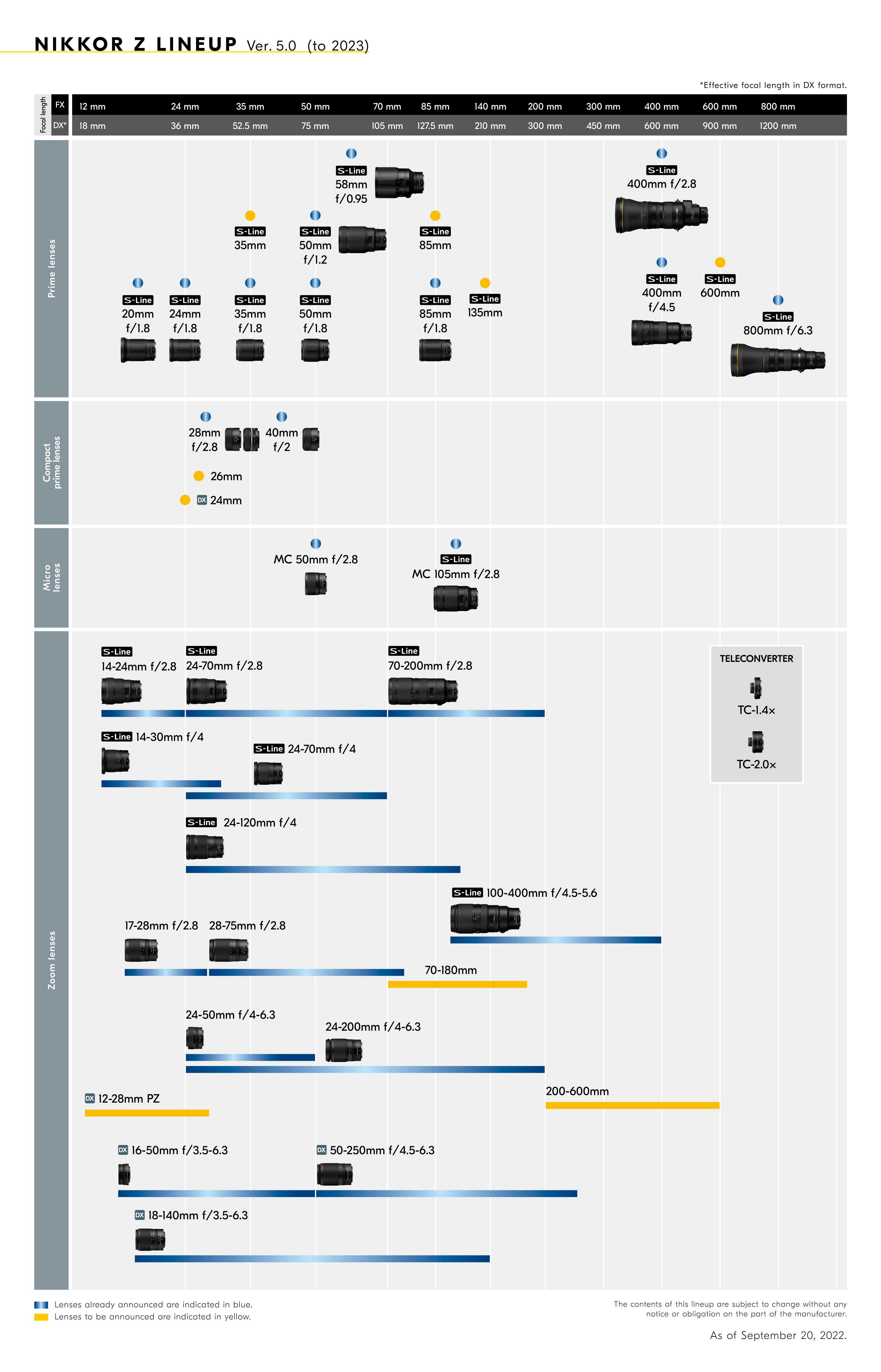 Non mancheranno poi le ottiche fisse come la Nikkor Z 35mm S-Line che potrebbe avere un'apertura di f/1.2 come nel caso del modello Nikkor Z 85mm S-Line (che ancora deve essere svelato). Altra soluzione sarà il Nikkor Z 135mm S-Line che invece punterà su un'apertura di f/1.8 (forse) e ci sarà spazio anche per il Nikkor Z 600mm S-Line per gli sportivi o i fotografi naturalistici. Sempre in tema di ottiche future, Nikon punterà su due modelli compatti, uno da 24 mm per APS-C e uno da 26 mm per full-frame.