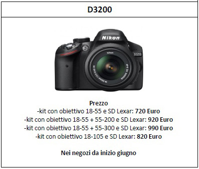 Nital, il distributore ufficiale per l'Italia dei prodotti Nikon, ha annunciato i prezzi di Nikon D3200, reflex entry level con sensore in formato Nikon DX APS-C da 24,2 megapixel di recente presentazione.
