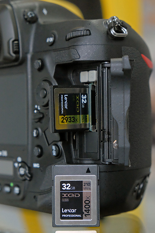 Ha tenuto parecchio banco la scelta di Nikon di mettere i fotografi di fronte a un bivio: ossia avere una macchina con doppio slot XQD o doppio slot CF, senza possibilità di slot misto. La ragione tecnica è semplice: mescolando gli slot le prestazioni del bus sono limitate da quello meno performante, per cui non si sarebbero potute sfruttare a pieno le potenzialità delle schede XQD. Per rendere l'idea la raffica a piena risoluzione a 12 frame al secondo, utilizzando le Compact Flash vede le classiche limitazioni con rallentamento quando lo svuotamento del buffer non riesce a tenere il passo della creazione delle immagini: con le XQD il problema scompare del tutto e si può scattare in qualsiasi formato senza limiti fino al riempimento della scheda. Per alcuni il cambio del parco schede rappresenterà un investimento anche consistente, ma Nikon spinge sull'adozione del nuovo formato per sfruttare al meglio le caratteristiche tecniche della macchina. In ogni caso la sostituzione del blocco con le due schede è stata resa volutamente semplice e possibile: che scegliesse la versione CF (da ordinare in modo personalizzato) potrà poi passare alla versione XQD con il semplice costo dell'intervento di sostituzione.