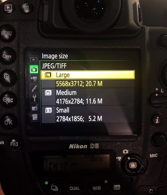 Le foto mostrano una fotocamera molto simile al modello precedente Nikon D4s nell'ergonomia generale, con alcune piccole differenze a livello della disposizione dei tasti. Assieme alle foto sono trapelate anche alcune delle specifiche tecniche: la più attesa era quella relativa alla risoluzione del sensore, che sfornerà immagini a 5568x3712, pari a 20,7 megapixel. Le fonti riportano che si spingerà fino a 102.400 ISO nativi e che il modulo autofocus avrà un'area molto ampia, coperta da 153 punti di messa a fuoco.