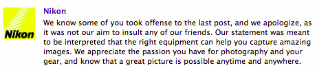 Le proteste sono stati tali da costringere Nikon a un post di scuse, sempre su Facebook, specificando meglio l'intenzione del precedente intervento.