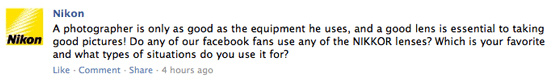 L'intento era certamente quello di far riflettere i propri fan sull'importanza di avere un buon corredo per poter ottenere foto di qualità e nel contempo lanciare tra essi un piccolo sondaggio su quali obiettivi utilizzano maggiormente. Il tono del post pubblicato da Nikon su Facebook è risultato però fin troppo provocatorio: "A photographer is only as good as the equipment he uses".