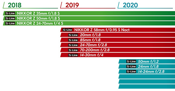 L'offerta iniziale prevede due fissi e uno zoom: Nikkor Z 35mm f/1.8 S e Nikkor Z 50 f/1.8 S vanno a popolare con alcuni fondamentali la line up della serie Z, senza dimenticare il "classico" zoom con focale 24-70mm, ovvero il Nikkor Z 24-70mm f/4 S, sebbene non con la luminosità che ci saremmo attesi (f/2.8, per intenderci). Uno scetticismo di cui Nikon è ovviamente consapevole, poiché la versione "2.8" è prevista per il 2019, quando è previsto il lancio di ben 6 nuove ottiche. Oltre all'anticipato Nikkor Z 24-70mm f/2.8 saranno aggiunte altre tre ottiche fisse: 20mm f/1.8, 85mm f/1.8 ma soprattutto l'atteso Nikkor Z 58mm f/0,95 S Noct, anticipato da molte voci in tempi recenti.