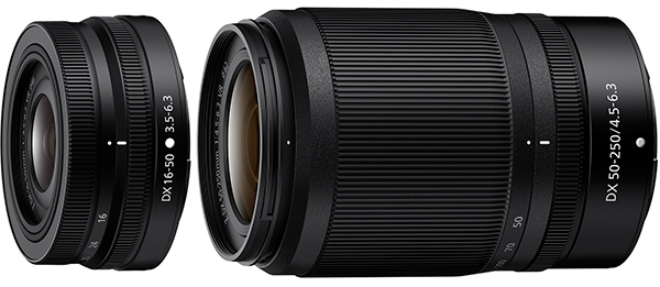 La fotocamera, come detto, sarà accompagnata inizialmente da due ottiche zoom. Lo zoom standard Nikkor Z DX 16-50mm f/3.5-6.3 VR punta sulla massima riduzione degli ingombri e adotta un design collassabile. Offre stabilizzazione ottica VR (manca infatti quella sul sensore) e distanza minima di messa a fuoco di circa 20 centimetri. Stabilizzato anche il telezoom Nikkor Z DX 50-250 mm f/4.5-6.3 VR, di design tradizionale, ma comunque anch'esso molto compatto.