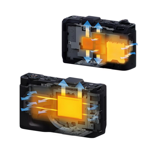 Il design è leggero e robusto, con un corpo in lega di magnesio da 630 grammi, senza ventola interna ma con dissipazione termica ottimizzata, garantendo fino a 125 minuti di registrazione 6K 60p in RAW con alimentatore esterno.