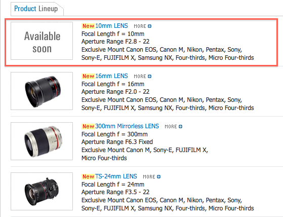 Recentemente in una discussione su Facebook è emersa una buona notizia per tutti i possessori di mirrorless Fujifilm X: Samyang ha in mente di mettere a disposizione con baionetta X-Mount tutta la sua gamma di ottiche, si tratta quindi di una conferma alla disponibilità delle ottiche 12mm f/2.0 e 10mm f/2.8 già annunciata.