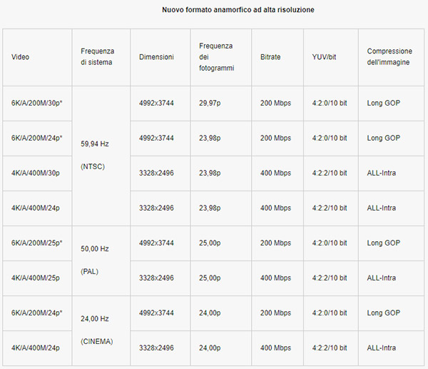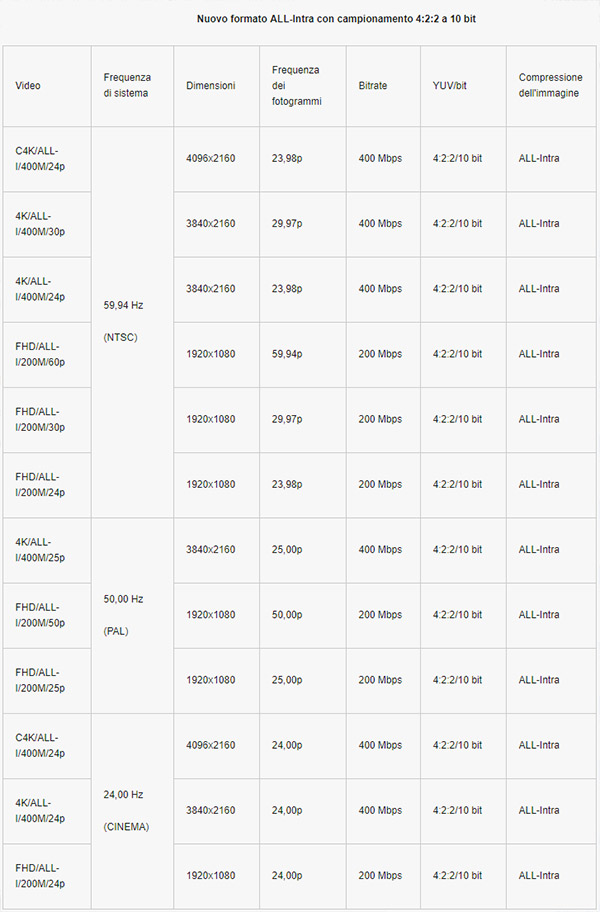 Ma è soparattutto il nuovo formato ALL-Intra per le riprese video a catalizzare l'attenzione di molti. Le registrazioni video in 4K/FHD possono essere effettuate con formato ALL-Intra con campionamento 4:2:2 a 10 bit, secondo lo schema che riportiamo qui sotto.