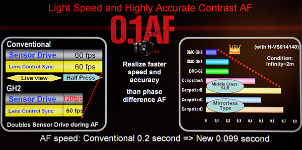 L'autofocus a contrasto rinnovato e reso più veloce e accurato, è uno dei punti chiave della nuova GH2. Il sistema autofocus lavoran a 120fps durante la messa a fuoco e Panosonic dichiara 0,1 sec come miglior tempo di messa a fuoco. Le caratteristiche del nuovo autofocus naturalmente si riflettono anche nell'ambito video.